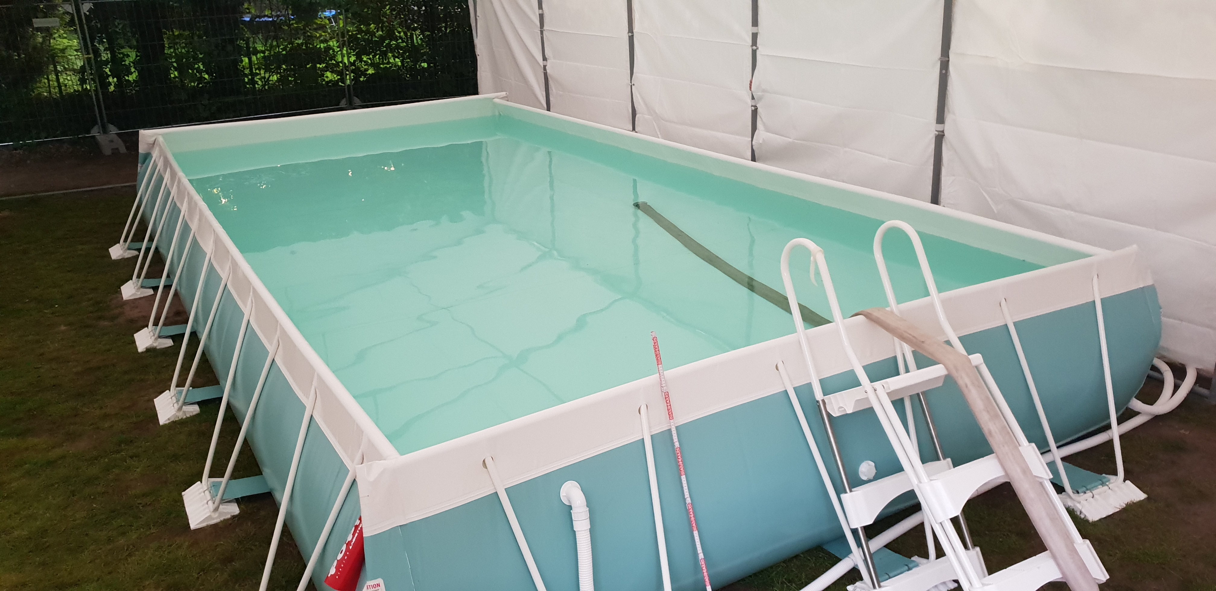 Heute war dann die feierliche Eröffnung des Schwimmbades. Bis zum 28. Juni werden die 8 ehrenamtlichen Helfer u.a. der DLRG täglich Kinder betreuen und diese an das feuchte Element gewöhnen. Durch die integrierte Heizung kann eine konstante Wassertemperatur von 27 Grad gewährleistet werden.